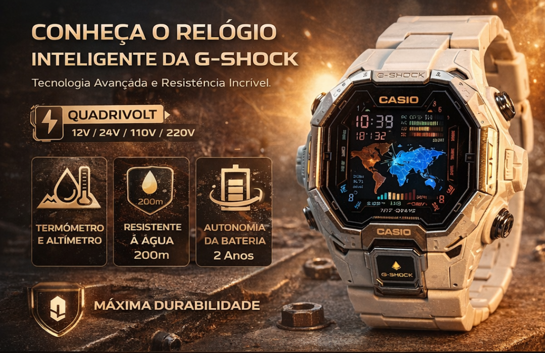 Estoque limitado. Garanta agora o seu Relógio G-SᏂock Ultra Resistente com Bluetooth e Energia Solar e experimente a combinação perfeita entre resistência, tecnologia e estilo.